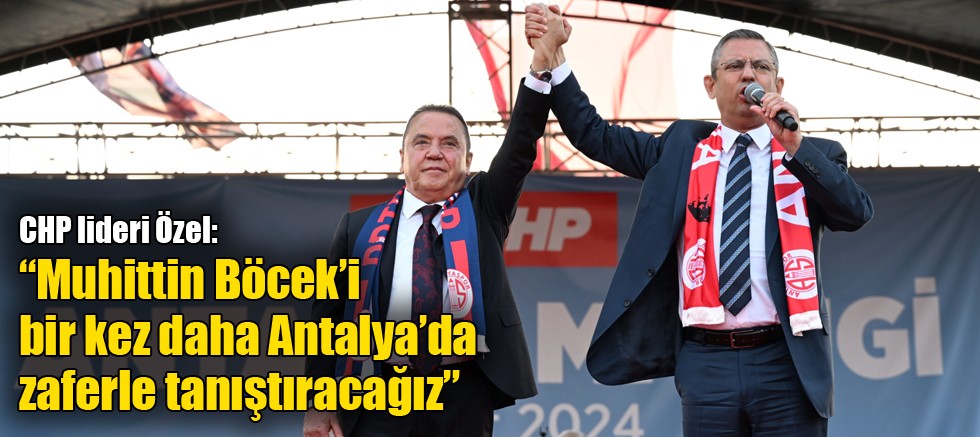 Cumhuriyet Halk Partisi (CHP) Genel Başkanı Özgür Özel, ‘Antalya Buluşması’nda binlerce kalabalığa seslendi. Antalya Büyükşehir Belediye Başkanı ve Adayı Muhittin Böcek’e destek isteyen Özel, “15 gün sonra bir tarih yazacağız. Hep birlikte tarihe geçeceğiz. Partimizi ve adayımız Muhittin Böcek’i bir kez daha Antalya’da zaferle tanıştıracağız. Çünkü Muhittin Böcek, insan ayırmaz, parti ayırmaz herkese eşit davranır, adil davranır. Muhittin Böcek’i Antalya’yı 5 yıl yöneten ve 5 yıl yönetmek isteyen partimizin güvenini kazanmış, Yörük delikanlısını, çalışkan delikanlıyı, yoksulluktan bugünlere emek emek gelmiş bu delikanlıyı Antalyalılara size emanet ediyorum” dedi.