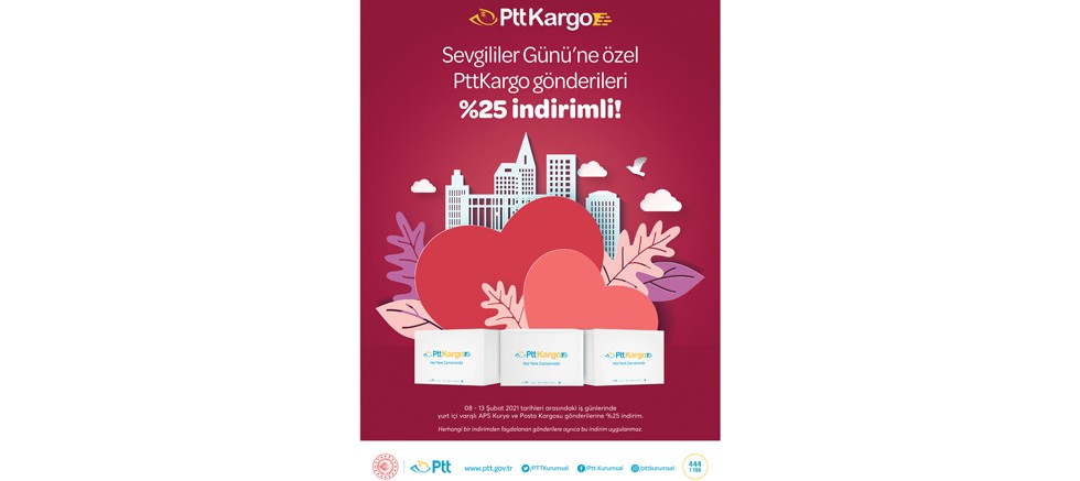 Türkiye’de posta, kargo, bankacılık, e-ticaret gibi birçok farklı alanda ulaşılabilir hizmet sunmayı amaçlayan Posta ve Telgraf Teşkilatı Anonim Şirketi (PTT AŞ), özel günlerde de müşterilerinin hayatını kolaylaştırmak adına çalışmalarını sürdürüyor. PTT, hazırladığı kampanya kapsamında Sevgililer Günü’ne özel 8 – 13 Şubat 2021 tarihleri arasındaki iş günlerinde yurtiçi varışlı APS Kurye ve posta kargosu gönderilerine yüzde 25 indirim uygulayacak.
