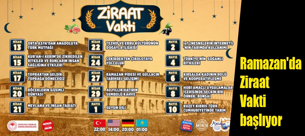 Antalya Tarım ve Orman Müdürü Gökhan Karaca, Ziraat Vakti’nin Ramazan boyunca 15 oturum olarak gerçekleşeceğini kaydetti. Pandemi tedbirleri kapsamında evlerinde kalan vatandaşları tarım ve gıdayla ilgili konularda bilgilendirmek amacıyla söyleyişiler gerçekleştireceklerini kaydeden Karaca, programa uluslararası katılım sağlanacağını belirtti. Karaca, Türkiye dışında KKTC, Azerbaycan, Kazakistan, İtalya, Fransa, Ürdün ve Almanya'dan da kayıt yaptırıldığını bildirdi.