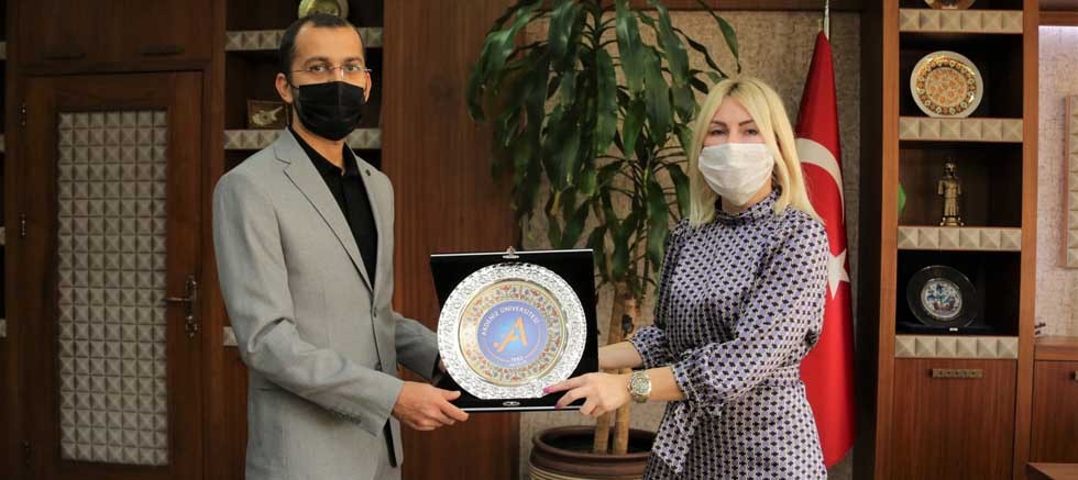 Rektör Özkan’a “Bilim ve tıp alanında yapmış olduğunuz fedakar katkılarınızdan dolayı Azerbaycan halkı adına sonsuz şükranlarımızı sunarız” yazılı plaket takdim eden Amil Hüseynov’a Rektör Özkan’da Akdeniz Üniversitesi plaketi verdi.