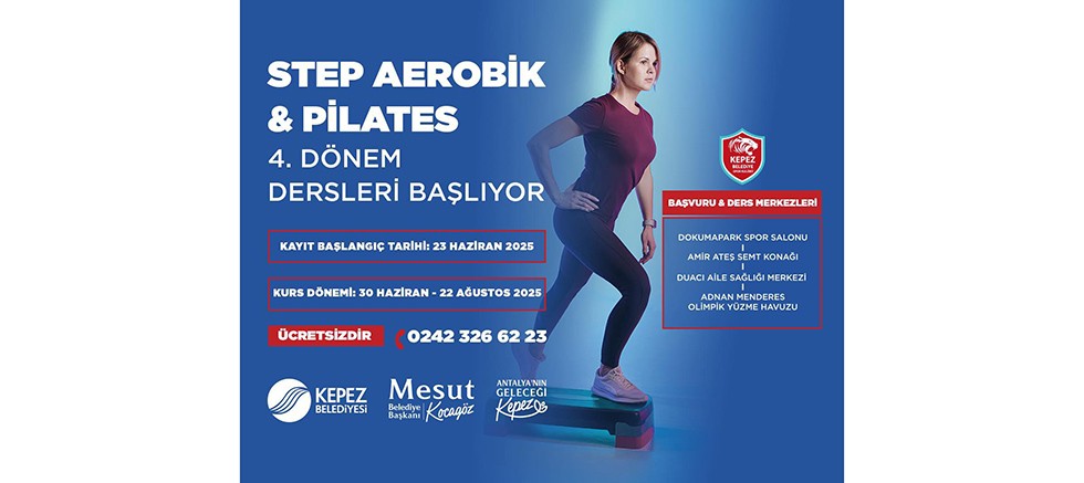 Spor yaparak formda kalmak ve zinde bir yaz geçirmek isteyen hanımları, Kepez Belediyesi’nin ücretsiz olarak sunduğu Step, Aerobik ve Pilates kursları bekliyor. Kepez Belediye Spor Kulübü’nün koordinasyonunda düzenlenen 4. Dönem kursları, 30 Haziran – 22 Ağustos tarihleri arasında gerçekleştirilecek. Kadınların hem fiziksel sağlığını desteklemek hem de sosyal yaşamlarına hareket katmak amacıyla açılan bu kurslara katılmak isteyenler, (0 242) 326 62 23 numaralı telefon hattından gerekli bilgilere ulaşabilir. Başvurular, Dokumapark Spor Salonu, Amir Ateş Semt Konağı, Duacı Aile Sağlık Merkezi ve Adnan Menderes Olimpik Yüzme Havuzu’na yapılabilecek.
