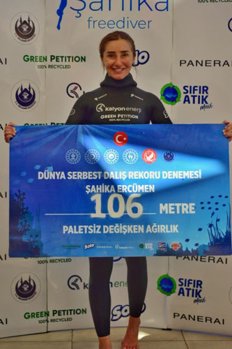 Dünya dalış rekortmeni milli sporcumuz Şahika Ercümen, bu defa eğitimde fırsat eşitliği için rekor kırdı! Türk Eğitim Vakfı (TEV) ile el ele vererek cumhuriyetimizin 100. yılında 100 kız öğrenciye destek olmak için Ercümen, 17 Ekim’de Hatay Yayladağı’nda gerçekleştirdiği 3 dakika 2 saniyelik dalışta paletsiz değişken ağırlık kategorisinde 106 metrelik dünya rekoruna imza attı. Bu kez öğrencilerin eğitimi için rekor kıran Şahika Ercümen, bu çerçevede TEV ile birlikte oluşturulan kampanya sayesinde depremzede öğrenciler öncelikli olmak üzere, spor alanında eğitim alan 100 kız öğrenciye destek sağlamayı hedefliyor. “Hatay’a Nefes Ol” başlığıyla hayata geçirilen kampanyaya "https://fonzip.com/tev/kampanya/hatay-a-nefes-ol"fonzip.com/tev/kampanya/hatay-a-nefes-ol adresi üzerinden bağış yapılabiliyor.