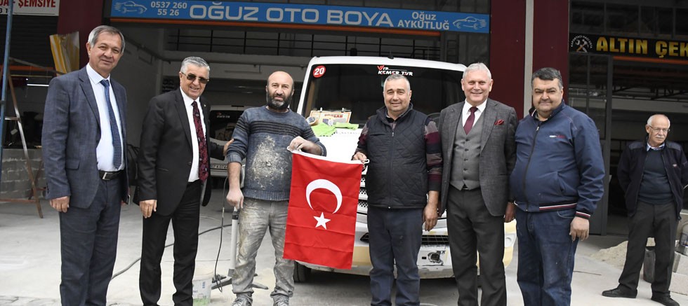 Kemer Belediye Başkanı Necati Topaloğlu, sanayi esnafıyla bir araya gelerek esnafa Türk Bayrağı hediye etti.