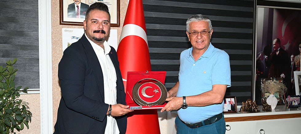 Ziyaret sonrası Mutaf, Başkan Topaloğlu’na plaket vererek hatıra fotoğrafı çektirdi.