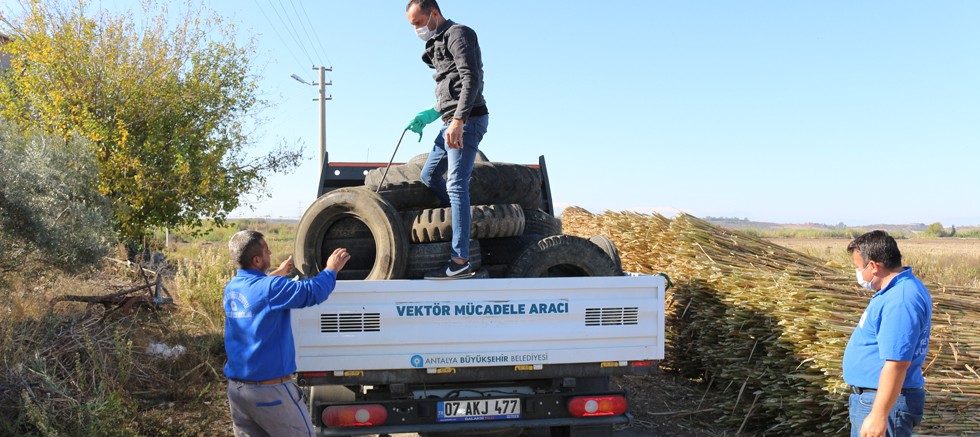 Serik’te sivrisinekle mücadele çalışmalarını aralıksız sürdüren Antalya Büyükşehir Belediyesi, sinek üremesine ortam oluşturan atık lastikleri de topluyor.