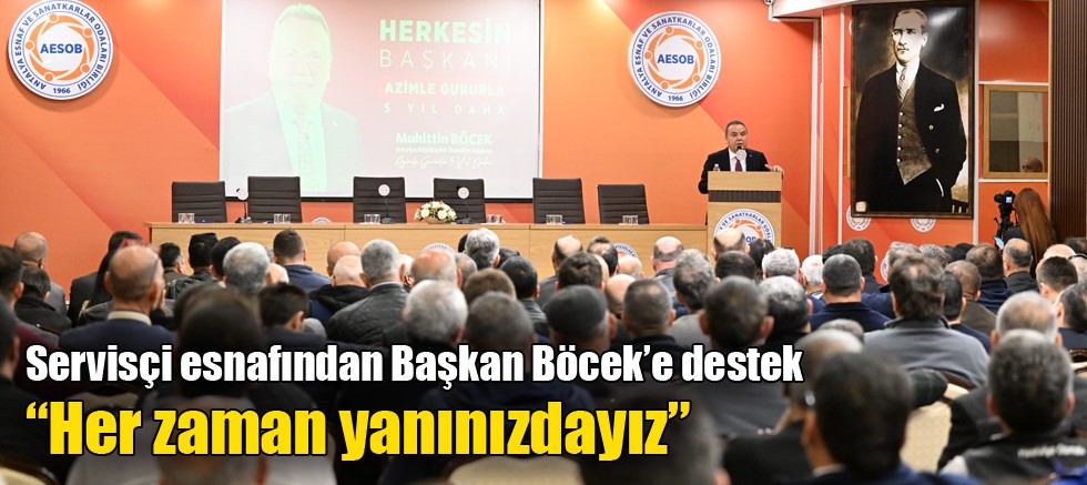 Antalya Servisçiler Odası Başkanı Süleyman Şahin, Büyükşehir Belediye Başkanı ve Başkan Adayı Muhittin Böcek’e destek vererek, “Sizin zamanında destan yazdık. Başkanımız esnafı enflasyona ezdirmemiştir. Servisçi camiası olarak her zaman sizin yanınızdayız” dedi. Başkan Böcek, yeni dönemde 11 katlı kavşak yapacaklarını söyledi.
