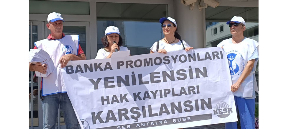 Güllük Postanesi önünde konuya dair bir basın açıklaması yapan SES Antalya Şube Eş Başkanı Şükran İçöz “ Sağlık ve sosyal hizmet emekçileri olarak ücretlerimiz üzerinden bankaların elde ettiği kardan payımızı istiyoruz, banka promosyonları derhal yenilenmelidir. Bugün imzalarımız yerlerine teslim edilirken yetkililerden hızlıca bir çözüm üretmelerini bekliyoruz. Bankalara da çağrımızdır, biz emekçilerin maaşları üzerinden sağladığınız bu kadar kara rağmen promosyonların düzeltilmesinde zorluk çıkarılması halinde tüketimden gelen gücümüzü de kullanarak boykotlar örgütleyeceğimizin bilinmesini istiyoruz” dedi. Promosyon anlaşmalarında kurumların taleplerini dikkate almasını isteyen Şükran İçöz taleplerini şu şekilde sıraladı: