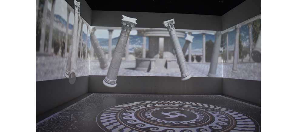 “Dijital deneyimanlayışında kullanılan videonun bir diğer çıkış noktası, agoranın ortasındabulunan şans/kader tanrıçası Tyke’ye adanmış tapınak. Tyke, antik dönemdeelinde ‘çarkıfelek’ denilen disk ile temsil edildiğinden, mozaiklerde görülençarkıfelek deseni de videonun görsel unsurlarından biri. Çarkıfelek bizi zamaniçinde yolculuğa çıkarıyor; kimi zaman denizler altında geziyor, kimi zamankente uzaktan bakıyoruz. Çarkıfelek bizi, antik dönemde deniz ticaret sezonununbaşlangıcını kutlamak için yapılan Athena şenliklerine götürüyor. Anıtsal çeşmeönünde toplanıyor, agoradan geçip Athena ve Apollon tapınaklarına adaklarbırakıyoruz. Arkasında nar ağacı, önünde tanrıça heykeli bulunan bir tekneyleAkdeniz’e açılıyor, Side’nin meşhur gün batımını antik dönemdeymişçesinedeneyimliyoru