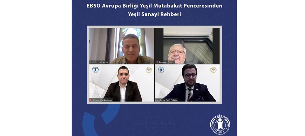 Bu kapsamda Ege Bölgesi Sanayi Odası ile birlikte hareket eden iş örgütü, EBSO tarafından, sanayicilere yol göstermek amacıyla hazırlanan ‘Avrupa Birliği Yeşil Mutabakat Penceresinden Yeşil Sanayi Rehberi’ çalışmasını EGİAD üyelerine tanıttı. EBSO Çevre Komitesi Başkanı Erdoğan Çiçekçi, Ege Üniversitesi Biyomühendislik Bölümü Öğretim Üyesi ve EBSO Çevre Çalışma Grubu Üyesi Prof. Dr. Nuri Azbar'ın katılımlarıyla online olarak gerçekleşen toplantıda, AB Yeşil Mutabakatı gözden geçirilerek, sektör bazlı dikkat edilmesi gereken noktalar ile uyum için atılacak adımlar değerlendirildi.