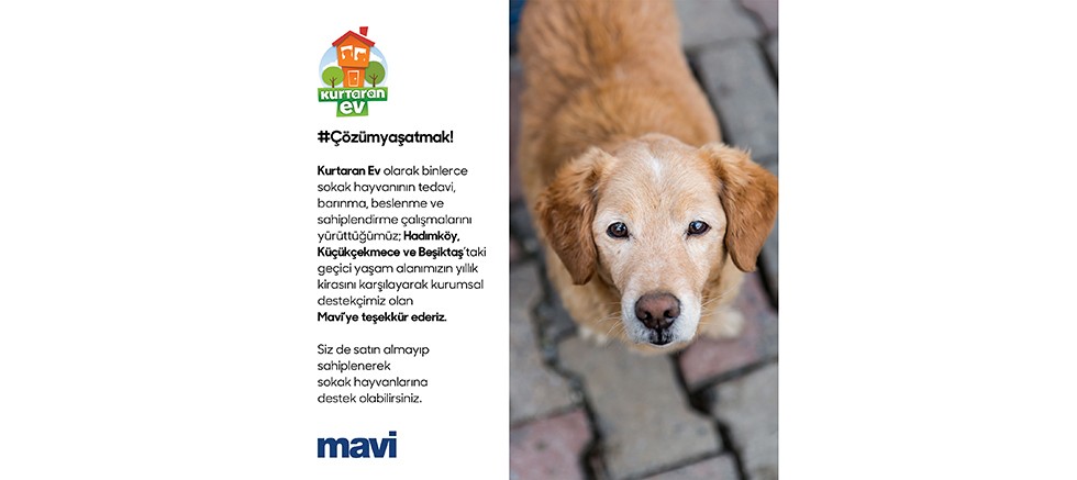 Türkiye’nin öncü jean ve hazır giyim markası Mavi, yardıma muhtaç̧ hayvanlara sahiplenilecekleri ana kadar geçici yaşam alanı sunan Kurtaran Ev’in kurumsal destekçisi oldu. İş birliği kapsamında Mavi, binlerce sokak hayvanının tedavi, barınma, beslenme ve sahiplenme çalışmalarının yürütüldüğü, Hadımköy, Küçükçekmece ve Beşiktaş’taki geçici yaşam alanlarının yıllık kirasını karşıladı.