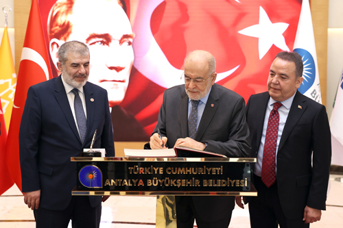 Antalya Büyükşehir Belediye Başkanı Muhittin Böcek, bir dizi temas ve programlara katılmak için Antalya’ya gelen Saadet Partisi Genel Başkanı Temel Karamollaoğlu’nu dün akşam havalimanında karşıladı. Karamollaoğlu bugün de, Genel Başkan Yardımcıları Mustafa Kaya, ve Ersan Bilgin, İl Başkanı Ramazan Düzen, yönetim kurulu üyeleri ve Büyükşehir Belediyesi Meclis Üyesi Mehmet Manavoğlu ile birlikte Büyükşehir Belediye Başkanı Muhittin Böcek’i makamında ziyaret etti. Karamollaoğlu Belediye ziyareti kapsamında ilk olarak şeref defterini imzaladı.