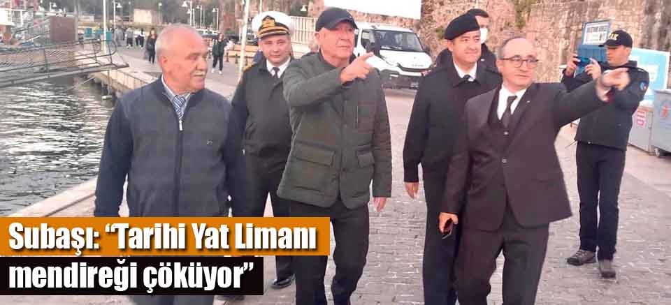 İYİ Parti Antalya Milletvekili Hasan Subaşı, antik çağlardan kalan ve 2. Dünya Savaşı’ndan sonra yenilenerek yaptırılan Antalya Kaleiçi Yat Limanı’ndaki mendirekte meydana gelen çatlamaların can güvenliği açısından tehlike oluşturduğuna dikkat çekerek, Ulaştırma ve Altyapı Bakanı Adil Karaismailoğlu ile Kültür ve Turizm Bakanı Mehmet Ersoy’u göreve çağırdı. Subaşı, tehliye dikkat çekmek için TBMM Başkanlığına hem Ulaştırma ve Altyapı Bakanlığı hem de Kültür ve Turizm Bakanlığı tarafından cevaplandırılmak üzere ayrı ayrı iki soru önergesi verdi.