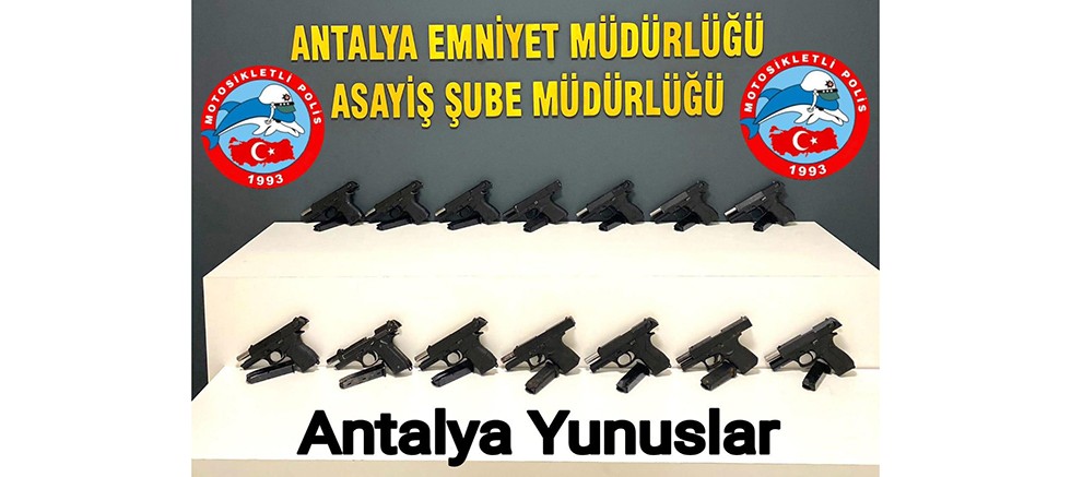 İlimiz Muratpaşa İlçesi Yeşildere Mahallesi Gazi Bulvarı yan yolu üzerinde yapılan yol uygulamasında, durumundan şüphelenilerek durdurulan (3) şahsın bulunduğu araç içerisinde yolcu koltuğu üzerinde (1) adet tabanca olduğu tespit edilmiş, araç içerisinde yapılan aramada, koltuk altına zulalanmış toplam (13) adet daha tabanca ile toplam (14) adet tabanca ve tabancalara ait (14) adet şarjör ele geçirilmiştir.