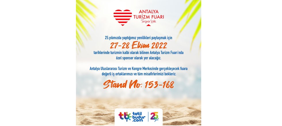 Türkiye’nin 56 ilinde 500’den fazla acentesi ve 2.500 seyahat danışmanı ile sektörün öncülerinden TatilBudur; sektördeki 25 yıllık deneyimi ile Antalya Turizm Fuarı’na özel sponsor olarak katılıyor.Web sitesi ve mobil uygulamalarında yıllık 55 milyon üzeri ziyaretçiye sahip olan Tatilbudur.com fuarda 153-168 No’lu standında profesyonelleri ağırlayacak. 27-28 Ekim tarihlerinde gerçekleşecek olan Antalya Turizm Fuarı’nda marka 2022 Turizm Sezonunu değerlendirirken 2023 Turizm Sezonu için de ilk cümlelerini kuracak.