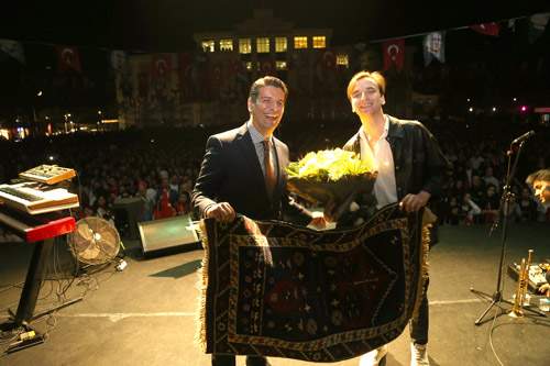 Belediye Başkanı Turgay Genç yine sahneye çıkarak Melek Mosso’ya Döşemealtı Halısı ve çiçek verdi. Turgay Genç, “Türk milletinin bağımsızlığı bir karakter olarak benimsediğinin yegane kanıtı olan Türkiye Cumhuriyetinin kuruluşunun 99’ncu Yıldönümü kutlu olsun. Bu coşkuya eşlik etmek için buraya gelen herkese çok teşekkür ederim. Ülkemizin kurucusu Ulu Önderimiz Gazi Mustafa Kemal Atatürk'ün “En Büyük Eserim” dediği Cumhuriyet, sadece bugünün değil geleceğimizin de en büyük güvencesidir. Bizlere emanet edilen Türkiye Cumhuriyetini sonsuza kadar korumak için var gücümüzle mücadele edeceğiz. Bu duygu ve düşüncelerle tüm milletimizin 29 Ekim Cumhuriyet Bayramını en içten dileklerimle kutluyorum.”dedi.