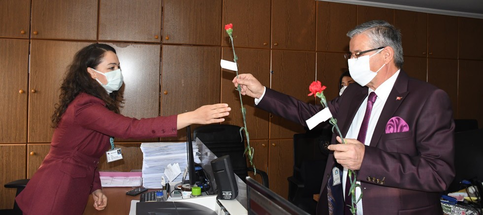Başkan Topaloğlu, ilk olarak belediye binasındaki kadın personelin gününü tebrik ederek, karanfil dağıttı.