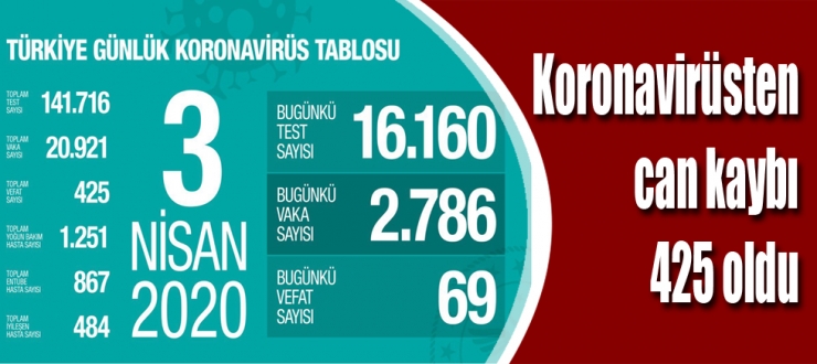 Koca, son 24 saatte 16 bin 160 test yapıldığını, 2786 pozitif vaka tespit edildiğini, bugün 69 kişi ile toplam can kaybının 425 olduğunu açıkladı. Koca "Tedavisi devam eden hastalardan 1251'i yoğun bakımdadır. Bunların 867'si solunum cihazına bağlı durumda olup, 484 hastamız iyileşip taburcu olmuştur. Nüfusa göre en riskli illerimiz İstanbul, Ankara, İzmir, Konya'dır. 20 yaşından itibaren daha yoğun görüldüğü, erkellerin kadınlara göre görülme oranının daha yüksel olduğunu söylemek istiyorum. Gençlerim hastalığı ya hissetmemekte yada hafif geçirdiğini daha önce ifade etmiştim. Şuan 25 ilde can kaybımız olmadı. En yüksek can kaybımız 210 ile İstanbul.