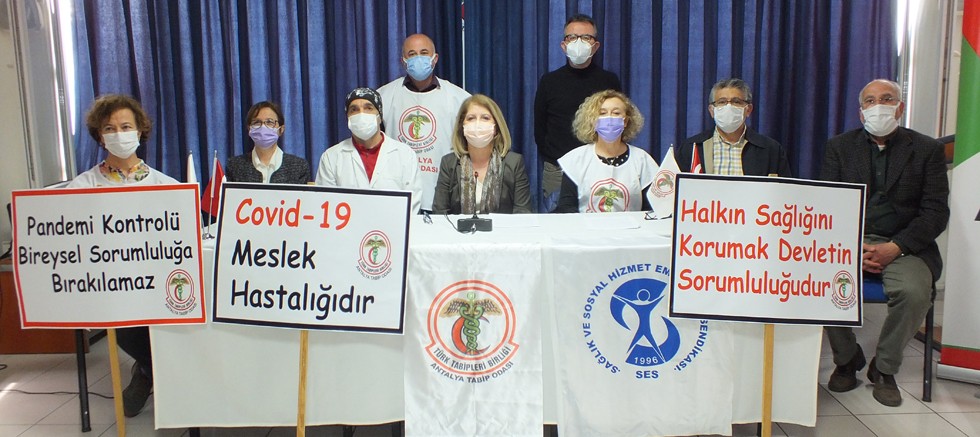 Pandemi sürecinde sağlık çalışanlarının özverili çalışmalarına karşılık salgının başlangıcından itibaren Sağlık Bakanlığı tarafından yeterince korunamama, salgını yönetmedeki başarısızlıklar sonucunda 150 binden fazla sağlık çalışanı hastalanmış ve 385’si vefat etmiştir. Ağır çalışma koşulları hekim ve sağlık çalışanlarında tükenmişlik yaratmıştır. İnsan hakları ve Uluslararası Çalışma Haklarına aykırı olarak emeklilik, izin ve istifa hakları ellerinden alınan sağlık çalışanlarının özlük hakları ve çalışma koşulları pandemi süresince kötüleşmiştir.
