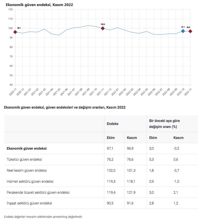 Türkiye İstatistik Kurumu (TÜİK), 2022 yılı Kasım ayı ekonomik güven endeksi verisini açıkladı. Ülkemizde ekonomik güven endeksi 96,9 oldu
