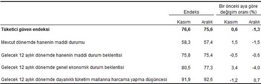Türkiye İstatistik Kurumu ve Türkiye Cumhuriyet Merkez Bankası işbirliği ile yürütülen tüketici eğilim anketi sonuçlarından hesaplanan mevsim etkilerinden arındırılmış tüketici güven endeksi, Aralık ayında bir önceki aya göre %1,3 oranında azaldı; Kasım ayında 76,6 olan endeks, Aralık ayında 75,6 oldu.