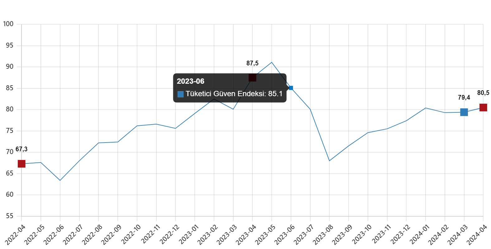 Türkiye İstatistik Kurumu ve Türkiye Cumhuriyet Merkez Bankası işbirliği ile yürütülen tüketici eğilim anketi sonuçlarından hesaplanan tüketici güven endeksi, Mart ayında 79,4 iken Nisan ayında %1,4 oranında artarak 80,5 oldu.