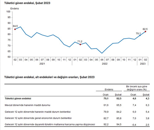 Türkiye İstatistik Kurumu ve Türkiye Cumhuriyet Merkez Bankası işbirliği ile yürütülen tüketici eğilim anketi sonuçlarından hesaplanan tüketici güven endeksi, Şubat ayında bir önceki aya göre %4,3 oranında arttı; Ocak ayında 79,1 olan endeks, Şubat ayında 82,5 oldu.