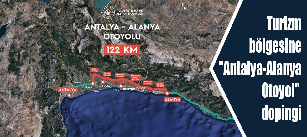 Turizm bölgesinde yer alan Antalya-Alanya güzergahında güvenli ve hızlı ulaşım için otoyol projesine Cumhurbaşkanlığı kararnamesi ile start verildiği belirtilen açıklamada, “Antalya-Alanya Otoyol Güzergahı, Serik Kavşağı’ndan başlayacak. Daha sonra doğuya yönelerek, Serik ve Manavgat ilçeleri sınırları içerisinde Toros Dağları’nın eteklerindeki koridoru takip edecek ve Konaklı’nın kuzeyinde Batı Kavşağı’nda sonlanacak” ifadeleri kullanıldı.