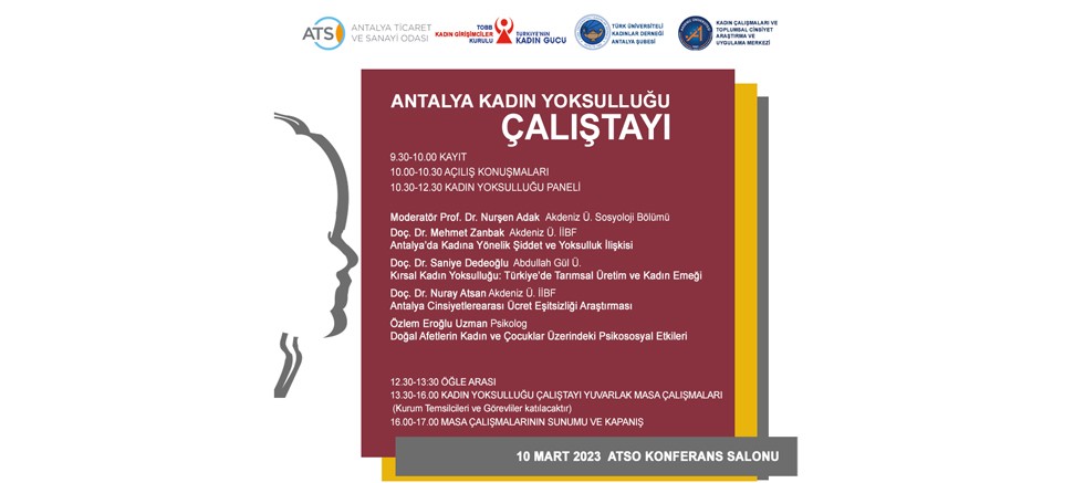 Cumhuriyetimizin 100. Yılında taze yaklaşımlarla çözümlememiz gereken en önemli sorunların başında kadın yoksulluğunun geldiğinin farkındalığıyla 10 Mart 2023 tarihinde ATSO Konferans Salonu’nda düzenlenecek “Antalya Kadın Yoksulluğu Çalıştayı”nda akademisyenler, sivil toplum örgütleri ve kamu kurumları temsilcileri yuvarlak masa çalışmalarında bir araya gelerek kadın yoksulluğuna karşı politika önerileri geliştireceklerdir. Ülkemiz kadınlarının yüzde yetmişinin istihdam dışında ve yoksulluğun pençesinde olduğu günümüzde bu manzaraya deprem koşullarının ağırlığının da eklenmesiyle çalıştay masalarında depremzede kadınların sorunlarının da ele alınması planlanmıştır. Bu çalıştayın sonuçlarının akademik camia ile birlikte ilgili sivil toplum kuruluşları ve kamu kurumlarında kadın yoksulluğuna yaklaşımlar açısından yeni ufuklar açacağını, taze çözümlere ilham vereceğini ve bu konuya odaklanan çabaların artacağını umut ediyoruz.