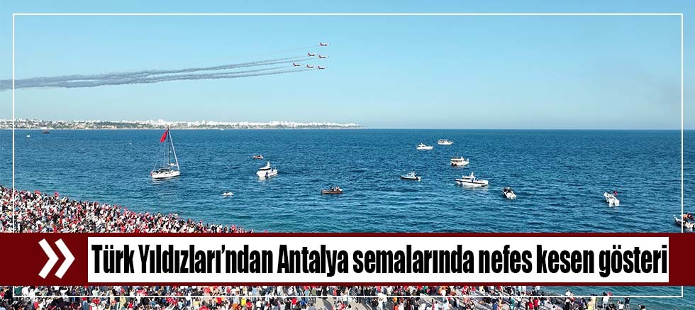 Türk Yıldızları’nın usta pilotlarının uçaklarla gerçekleştirdiği heyecan dolu gösteri, akrobasi timinde yer alan bir pilotun uçak içerisinden Antalyalıların bayramını kutlamasıyla başladı. Pilotun uçak içinden sesini duyan Antalyalılar bu kutlamaya alkışlarıyla karşılık verdi. Usta pilotların uçaklarla gerçekleştirdiği ters dönüşler ve manevralar ilgiyle izlendi. Türk Yıldızları, gökyüzüne uçaktan çıkan kırmızı dumanla kalp çizdi. Antalyalılar uçakların birbirlerine yakın mesafede gerçekleştirdiği hareketler karşısında nefeslerini tuttu. Dakikalarca gözlerini gökyüzünden ayırmayan vatandaşlar, bu anları cep telefonlarıyla ölümsüzleştirdi. Gösteri sonunda Antalya Büyükşehir Belediye Başkanı Muhittin Böcek, ekibe plaket takdim etti.