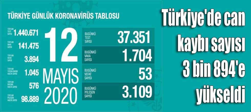 Sağlık Bakanlığı'ndan yapılan açıklamaya göre, Türkiye'de son 24 saatte 1704 kişiye Kovid-19 tanısı kondu, 53 kişi hayatını kaybetti, toplam vaka sayısı 141 bin 475, can kaybı 3 bin 894 oldu. Son 24 saatte 3 bin 109 kişinin daha iyileşmesiyle Kovid-19 tedavisi tamamlananların sayısı 98 bin 889 oldu.