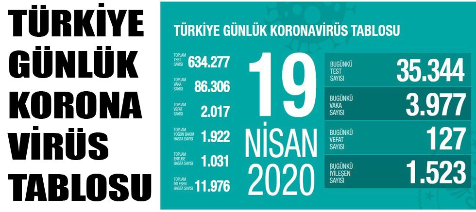 Türkiye'de son 24 saatte 3 bin 977 kişiye koronavirüs tanısı konulurken, 127 kişi hayatını kaybetti. Toplam vaka sayısı 86 bin 306, can kaybı 2 bin 017 oldu. Son 24 saatte Koronavirüs tedavisi tamamlanan bin 523 kişiyle birlikte toplam iyileşen kişi sayısı 11 bin 976 oldu.