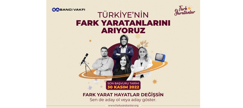 Sabancı Vakfı’nın 2009 yılından bu yana, Türkiye’de toplumsal gelişmeye katkıda bulunan bireylerin ve kurumların yaptıkları çalışmalarla yarattıkları olağanüstü etkileri görünür kılmak ve topluma ilham vermek amacıyla yürüttüğü “Fark Yaratanlar” programının 14. Sezon başvuruları başladı. Yeni dönemdeki Fark Yaratanlarını arayan programın başvuruları, 30 Kasım 2022 gün sonuna kadar www.farkyaratanlar.org adresi üzerinden gerçekleşiyor.