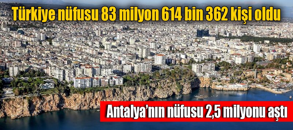 Türkiye İstatistik Kurumu (TÜİK), "Adrese Dayalı Nüfus Kayıt Sistemi 2020 Sonuçları"nı açıkladı. Buna göre ülkemiz  nüfusu 83 milyon 614 bin 362 kişi oldu. Antalya nüfusu 31 Aralık 2020 tarihi itibarıyla 2 milyon 548 bin 308 kişi, Isparta nüfusu 440 bin 304 kişi, Burdur nüfusu ise 267 bin 092 kişi oldu.