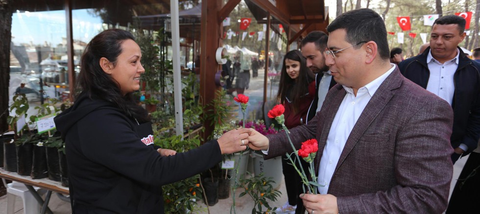 8 Mart Dünya Kadınlar Günü'nde, Antalya Köy Pazarı’nı ziyaret eden Kepez Belediye Başkanı Hakan Tütüncü, kırmızı karanfiller dağıtarak, kadınların gününü kutladı.
