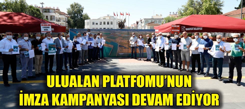 Manavgat Ulualan’ı Koruma Platformu’nun (MUKP) 7 noktada başlattığı imza kampanyası kent halkının yoğun ilgisi ve katılımıyla devam ediyor. Ulualan’da 3 bin dönüm arazi üzerine 4 adet golf alanı planlanmasına tepki gösteren Manavgat’taki STK’lar, Manavgat Ulualan’ı Koruma Platformu’nu kurmuş, yaptıkları basın açıklaması sonrasında ise imza kampanyası başlatmıştı. Şehrin önemli noktalarında, büyük mahallelerde ve Pazar yerlerinde başlatılan imza kampanyasına bütün oda başkanları, yönetimleri, siyasi parti ilçe başkanları stand başlarında beklemek suretiyle destek veriyor. Manavgat Belediye Başkanı Şükrü Sözen de her gün tüm standları gezerek, vatandaşlarla sohbet ediyor, Ulualan ile ilgili bilgilendirme yapıyor.