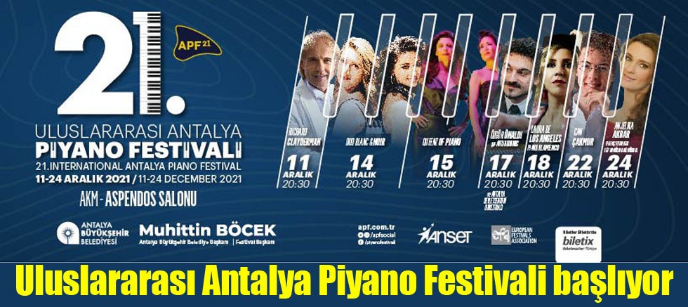 Bu yıl 21'incisi düzenlenen Antalya Büyükşehir Belediyesi’nin en önemli kültür-sanat etkinliklerinden biri olan Uluslararası Antalya Piyano Festivali 11 Aralık’ta başlıyor. Heyecanla beklenen etkinlik, dünyaca ünlü birçok yıldızı müzikseverlerle buluşturmaya hazırlanıyor. Yıldızlar geçidine sahne olacak festivalde bu yıl Richard Clayderman, Duo Blanc&Noir, The Queenz Of Piano, Artun Hoinic şefliğinde ve Antalya Devlet Senfoni Orkestrası eşliğinde Özgür Ünaldı, Laura De Los Angeles, Can Çakmur ve Anjelika Akbar yer alıyor.