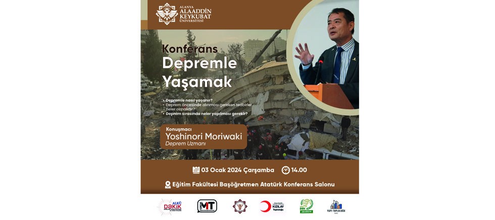 Alanya Alaaddin Keykubat Üniversitesi (ALKÜ) afetlerle ilgili bilgilendirici seminer ve konferanslar düzenlemeye devam ediyor. ALKÜ’de Türkiye’nin başlıca doğal afetlerinden biri olan deprem konusu ele alınacak. Deprem analizleriyle ünlü, Türkiye’de yaşayan Japon Deprem Uzmanı Yoshinori Moriwaki; “Depremle Yaşamak” isimli konferansta Alanyalılarla buluşacak. Konferans 3 Ocak 2024 Çarşamba günü ALKÜ Eğitim Fakültesi Başöğretmen Atatürk Konferans Salonu’nda saat 14.00’te düzenlenecek. ALKÜ Doğal Afet Arama Kurtarma İlk Yardım (DAKİK), ALKÜ Medya ve İletişim (MİT), İlk Yardım ve Afet Bilinci, ALKÜ Kızılay, Genç İHH Üniversite ve ALKÜ Yapı öğrenci toplulukları öncülüğünde düzenlenen konferansta “Depremde nasıl yaşanır? Deprem öncesi alınması gereken tedbirler neler olmalıdır? Deprem sırasında neler yapılması gerekir?” soruları değerlendirilecek.