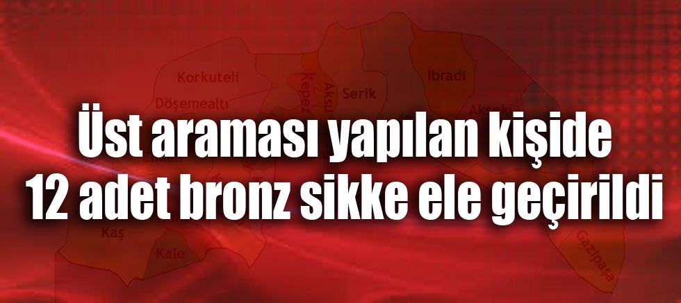 Konyaaltı İlçesi, Bahtılı Mahallesinde şüpheli hareketlerde bulunan D. E. isimli şahsın yapılan üst aramasında; 12 adet Roma dönemine ait bronz sikke ele geçirildi.