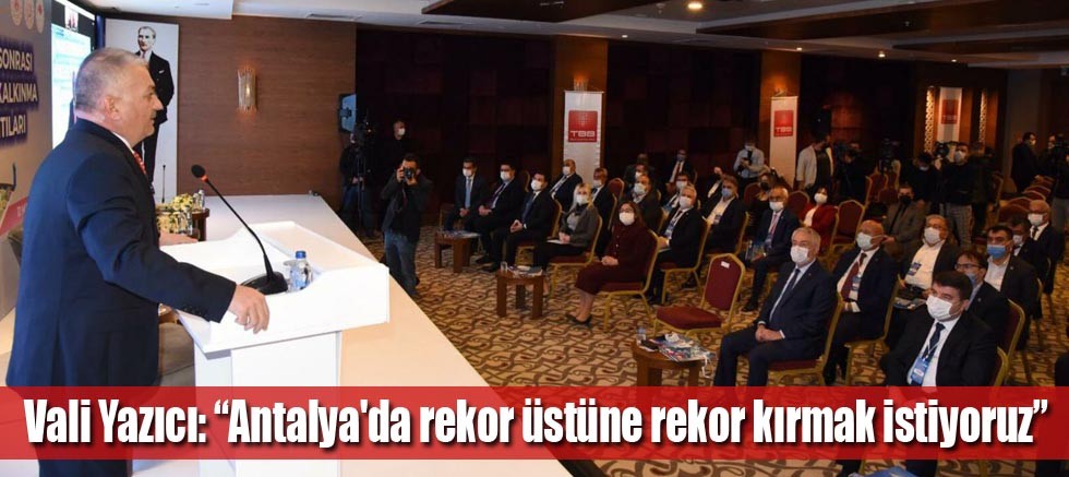 Türkiye Belediyeler Birliği'nin 'Pandemi Sonrası Bölgesel Kalkınma Toplantıları'nın 4'üncüsü Antalya'da düzenledi. Toplantıya katılan Vali Yazıcı, bu zorlu pandemi sürecini en kısa sürede geride bırakıp Antalya’da yeni rekorlar kıracaklarını ifade etti.