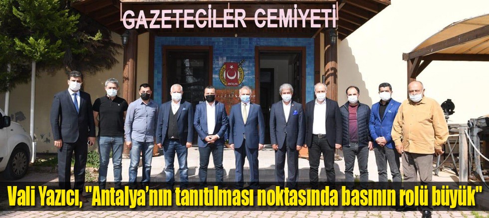 Antalya’nın dünyanın en önemli turizm merkezlerinden olduğunu ve şehrin ekonomisinin can damarının turizm olduğunu vurgulayan Vali Yazıcı; “Turizmin başkenti Antalya’mızın dünyaya tanıtılmasında basınımızın çok önemli bir rolü bulunmaktadır. Adeta yeryüzü cenneti olan Antalya’mızın güzelliklerinin yerli ve yabancı turistlere duyurulmasında son derece başarılı çalışmaları mevcut. Çok sayıda önemli organizasyona güven içerisinde ve başarılı bir şekilde ev sahipliği yapan Antalya’mızda, turizm sektörü başta olmak üzere, tüm sektörlerin başarıya ulaşmasında ve bu başarının da ülkemiz ekonomisine olumlu yönde yansımasında, basın çalışanlarımızın katkısı çok büyüktür.” diye konuştu.