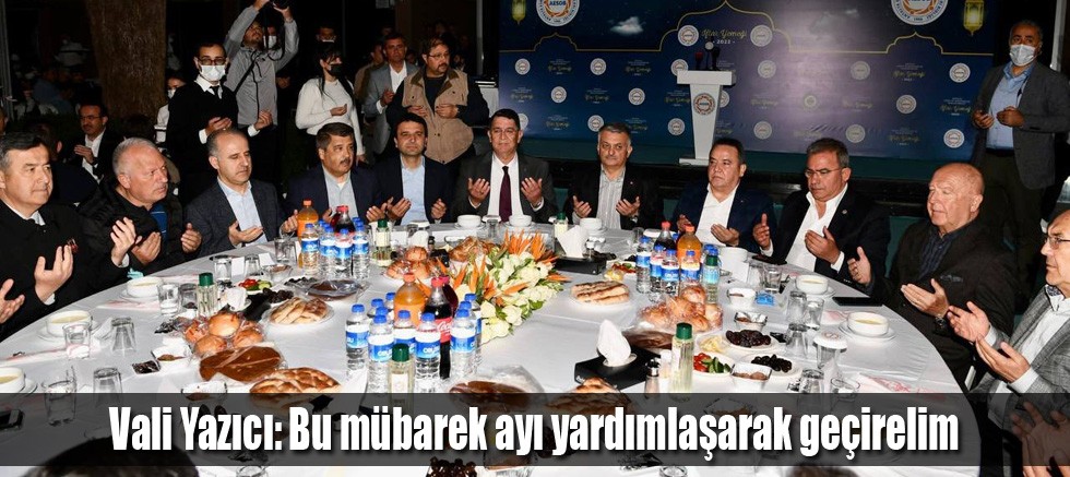 Vali Ersin Yazıcı, Antalya Esnaf ve Sanatkârlar Odaları Birliği (AESOB) Başkanı Adlıhan Dere’nin ev sahipliğinde düzenlenen İftar programına katıldı. Programda konuşan Vali Yazıcı, “Bu mübarek ayı yardımlaşarak ve fakr-u zaruret içinde bulunan vatandaşlarımıza yardım ederek geçirelim.” dedi.
