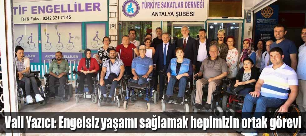 Vali Ersin Yazıcı, Engelliler Haftası münasebetiyle Türkiye Sakatlar Derneği Antalya Şubesi’ni ziyaret etti. Ziyarette dernek üyeleriyle sohbet edip taleplerini dinleyen Vali Yazıcı; “Engelsiz yaşamı sağlamak bizlerin insani olarak en büyük ortak görevi. Çünkü insana verilen değerin en belirgin yansıması engellilere verilen değer ve onlara sağlanan kolaylıklardır.” diye konuştu.