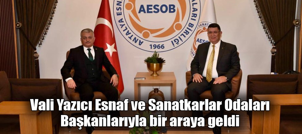 Antalya Esnaf ve Sanatkârlar Odaları birliği binasında düzenlene toplantıya katılan Vali Ersin Yazıcı, Antalya Esnaf ve Sanatkârlar Odaları Birliği (AESOB) Başkanı Adlıhan Dere ile Antalya merkezi ve ilçelerinde faaliyet gösteren 75 esnaf ve sanatkârlar odaları başkanıyla bir araya geldi. Toplantıda esnaf ve sanatkârların taleplerini, sorunlarını ve çözüm önerilerini dinleyen Vali Yazıcı, tüm sorunları bugüne kadar olduğu gibi bugünden sonra da birlikte çözeceklerini dile getirerek, bir esnaf çocuğu olarak daima esnafın yanında olduğunu ifade etti.