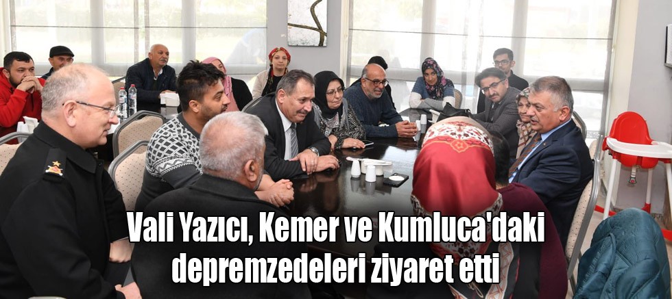 Vali Yazıcı, Kemer Kaymakamlığı Kriz Merkezi’ndeki incelemelerin ardından Kemer Uygulama Oteli’ne geçerek depremzede ailelerle bir araya geldi. Kemer Uygulama Oteli’nde kalan 41’i çocuk 173 depremzedeyi ziyaret ederek, geçmiş olsun dileklerini ileten Vali Yazıcı, depremzedelerin taleplerini dinledi.