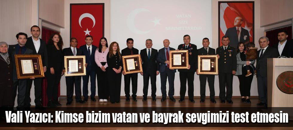 Vali Ersin Yazıcı, Devlet Övünç Madalyası ve Beratı Tevcih Töreni’nde Cumhurbaşkanı Recep Tayyip Erdoğan adına tevdi edilen madalya ve beratları takdim etti. Törende konuşan Vali Yazıcı; “Kimse bizim vatan ve bayrak sevgimizi test etmesin. Çünkü biz söz konusu vatan ve bayrak olduğunda şahadete koşan bir milletiz.” dedi.