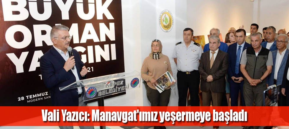 Fotoğraf Sergisi’nde açılış konuşmasını yapan Vali Ersin Yazıcı; “Bir yıl önce bugün Cumhuriyet tarihinin en büyük yangınına tanık olduk. Ciğerlerimiz yandı. Büyük Manavgat yangınında 60 bin hektara yakın bir alan yandı. Can kayıplarımız oldu. Bir orman yandığı zaman sadece ağaçlar kül olmuyor içinde ki bütün canlar da kül oluyor. Hala o hayvanların sesleri kulaklarımda ama toparlanıyoruz devletimiz güçlü, milletimiz hayırsever. Yangının ardından bu gücü ve yardımseverliği sonuna kadar hissettik. Ben tüm haklımızı ve tüm kurumları şimdiden uyarıyorum çok dikkatli olalım. Çünkü yangın ulaşılması güç bir noktada başladığında kontrol altına almak gerçekten çok zor. Yer ekiplerinin ulaşmaması halinde yangının kontrol altına alınması neredeyse mümkün değil. Gücümüz kuvvetimiz var ama esas olan böyle bir mağduriyetin başlamamış olması bunun içinde sadece dikkatli olmamız gerekiyor. Riskli alanlarda ateş sigara ve benzeri yangına sebebiyet verecek işleri yapmayacağız. Yapanları ikaz edeceğiz, gerekiyorsa Kolluk Kuvvetlerimize ve orman teşkilatımıza haber vereceğiz. Manavgat’ımız yeşermeye başladı 3-5 yıl içinde yemyeşil olacak. Orman Teşkilatı’mız bugün bir farkındalık oluşturmak ve yaşanan her şeyi tüm halkımızın görmesi için bir sergi düzenledi. Bu sergiyi tüm Antalyalıların görmesini istiyorum.” dedi.