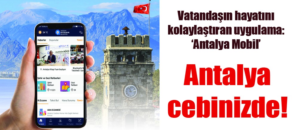 Her yıl ağırladığı yerli ve yabancı misafirler ile dünyanın gözdesi olan Antalya, artık cebinize sığacak. Antalya Büyükşehir Belediyesi Bilgi İşlem Dairesi Başkanlığı tarafından hayata geçirilen “Antalya Mobil” uygulamasıyla hayat kolaylaşıyor. Ücretsiz indirilen uygulamayla vatandaşlar, Antalya Büyükşehir Belediyesi’nin resmi internet sitesinde yer alan haberler, etkinlikler, ulaşım ve duyuruları görebildiği gibi borç sorgulama, borç ödeme, satın alma takibi gibi işlemler yapılabiliyor.