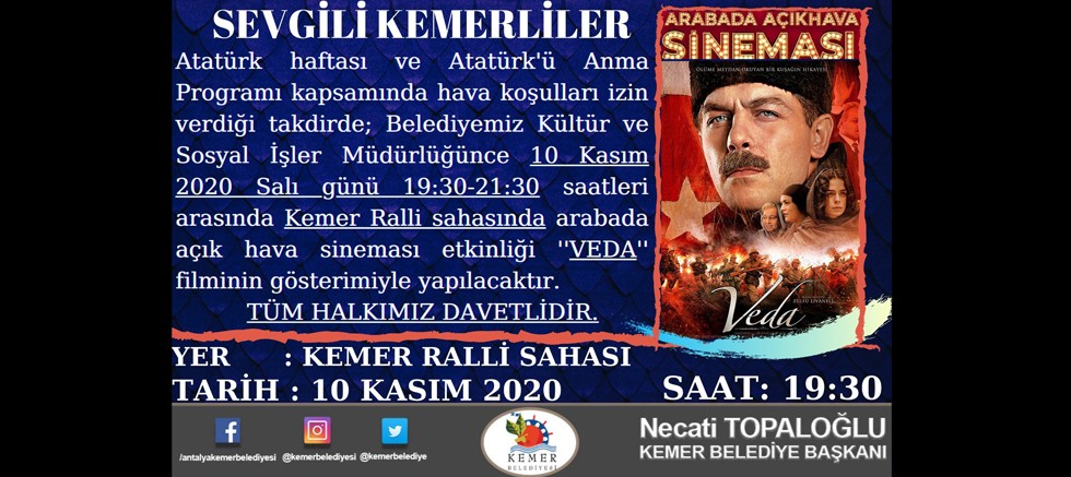 Atatürk Haftası ve Atatürk’ü anma programı kapsamında Atatürk’ü anlatan ‘Veda’ filminin gösterimi yapılacak.