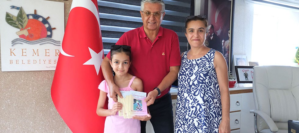 Göynük Ortaokulu 6. sınıf öğrencisi Ilgaz Aze Eskici, yazdığı kitabı Kemer Belediye Başkanı Necati Topaloğlu’na hediye etti.